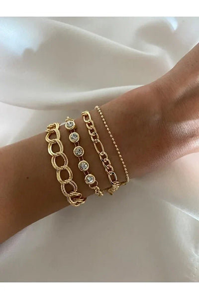 This bracelet set consists of four coordinated bracelets designed for a refined layered look. The white stone details add a clean and elegant touch that fits both daily wear and special occasions. Each bracelet can be worn together for a complete stacked style or individually for a simpler, minimal appearance. The adjustable fit suits most wrist sizes. Material: Base metal iron with white stone style beads. Lightweight and comfortable for everyday use. Suitable as a personal accessory or a thoughtful gift choice.