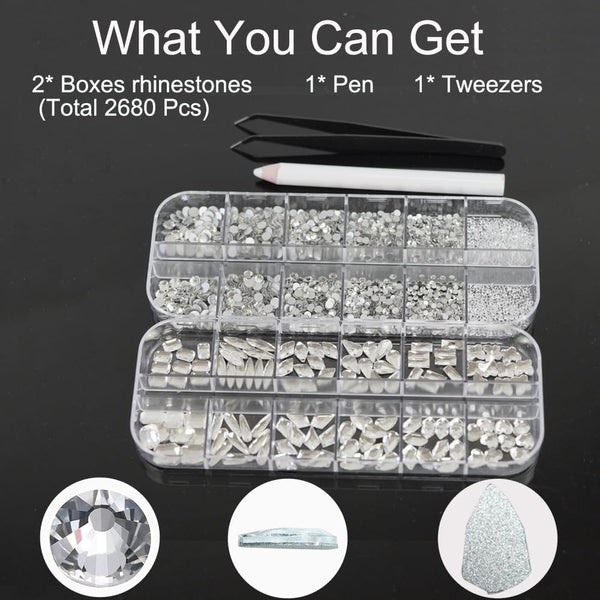 • The set includes: 2 boxes of crystal rhinestones, including 1 box with 12 different transparent crystal rhinestones (12 types * 10 pieces = 120 pieces); 6 different flat round crystal diamonds (2560 pieces total, 1.6mm~3mm): 1.6mm*900 pieces; 2.1mm*332 pieces; 2.3mm*332 pieces; 2.6mm*332 pieces; 2.8mm*333 pieces; 3mm*332 pieces; 1 pair of tweezers; 1 axe-shaped tool. With this set, you can easily create your own ideal art decoration.
