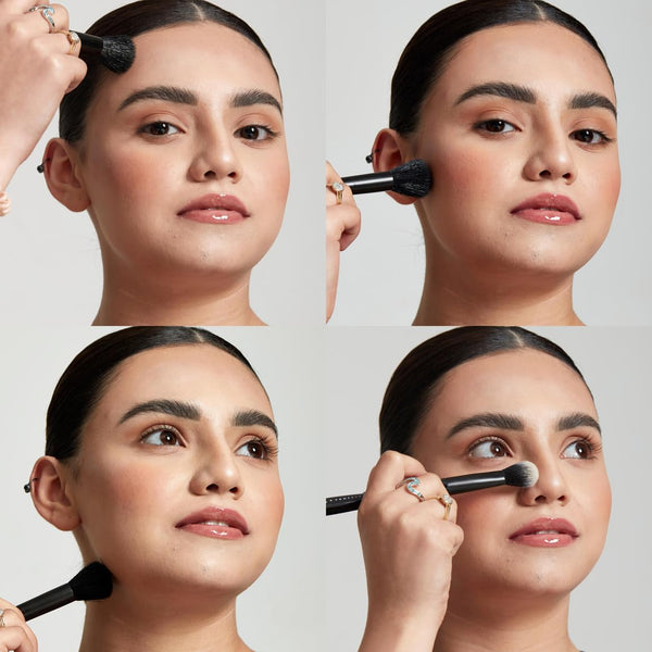 Apply the powder alone with a brush to the desired areas, or use it over a foundation for better hold. Use light shades to brighten and dark shades to contour your face, following its natural shape for a textured and natural look.